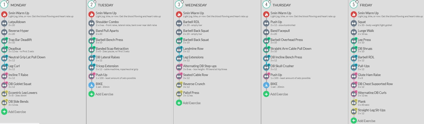 -Lower body 3x/ week, upper body pressing 2x/ week, upper body pulling 3x/ week, cardio 3x/week